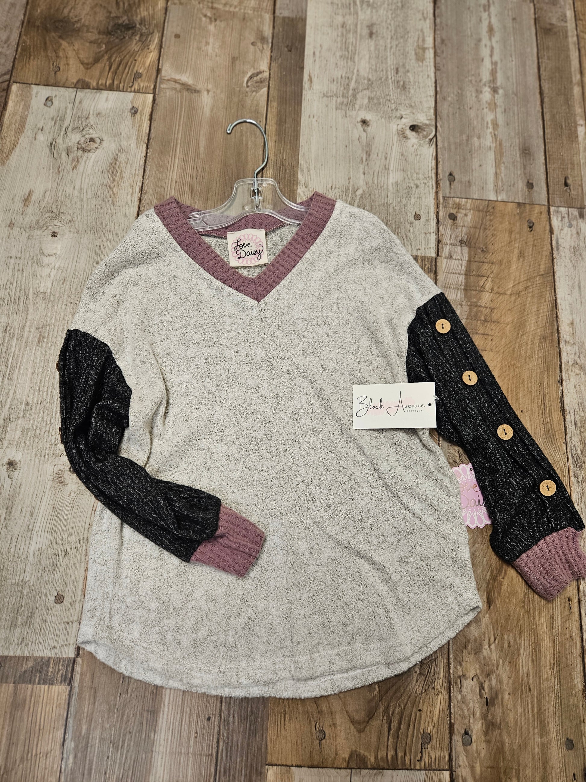 Expertly designed for fashion-forward girls, this beautiful heather grey sweater boasts a touch of trendy purple on its v-neck and cuffs. With unique faux button details on one sleeve, this cozy top is both stylish and comfortable. Keep warm in style with this must-have addition to your wardrobe.