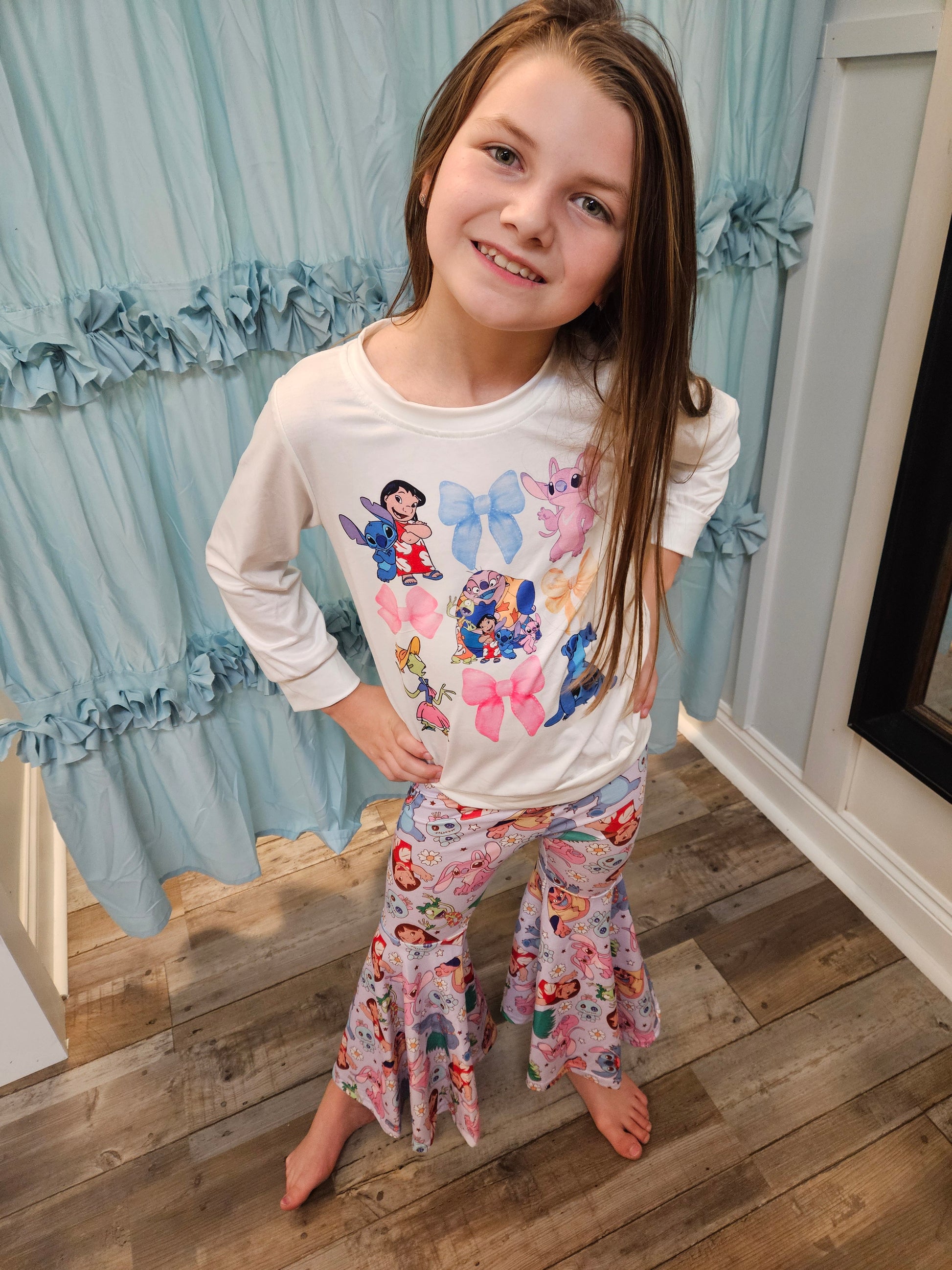 Introduce your little one to the magic of Disney with this Lilo & Stitch set. The girls' white long-sleeve top features adorable Lilo & Stitch characters and bows, while the printed bell bottoms are both cute and comfortable. Perfect for a day at Disney, this set will add a fun and unique touch to any outfit.