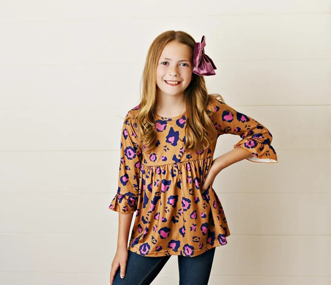 Expertly crafted with stylish rust-colored fabric, this cute 3/4 sleeve top features a bold animal print in vibrant purple and pink. The added ruffles at the bottom of the sleeves add a touch of feminine flair. Elevate your wardrobe with this must-have piece that brings a pop of color and style to any outfit.