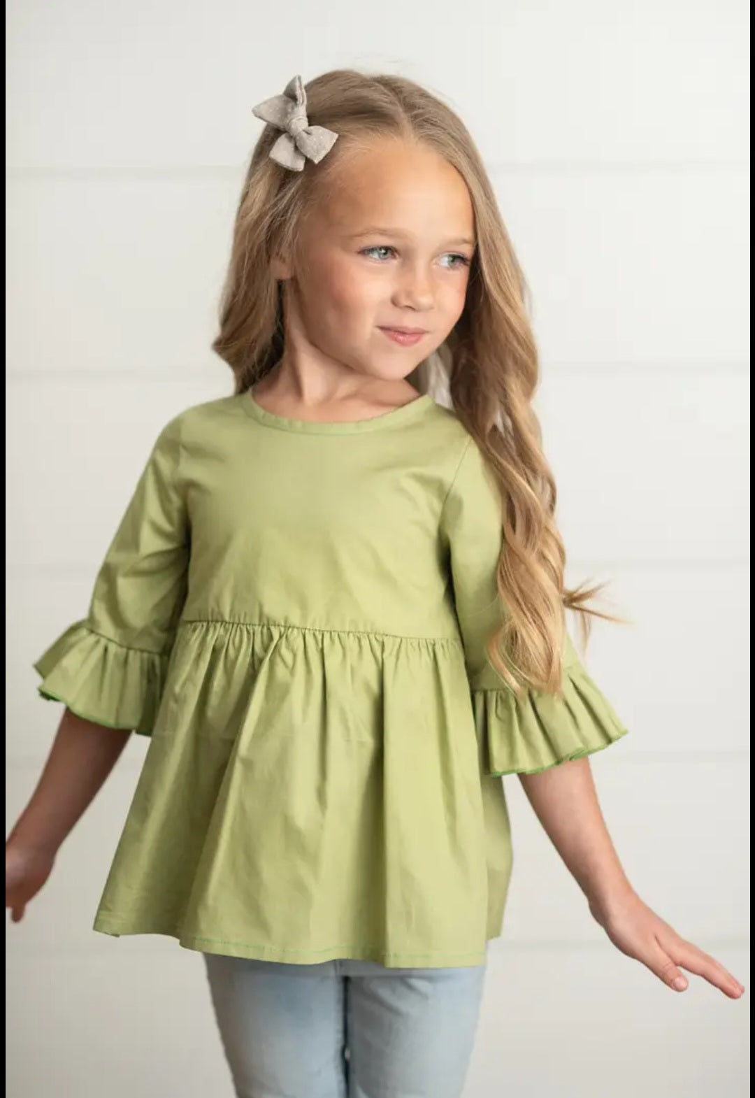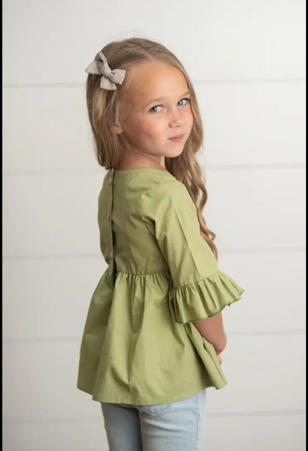 This girl sage green top features 3/4 sleeves with a ruffle detail, adding an elegant touch to the trendy design. The button detail on the back adds a unique element while also ensuring a perfect fit. Stay stylish and comfortable with this beautiful top.