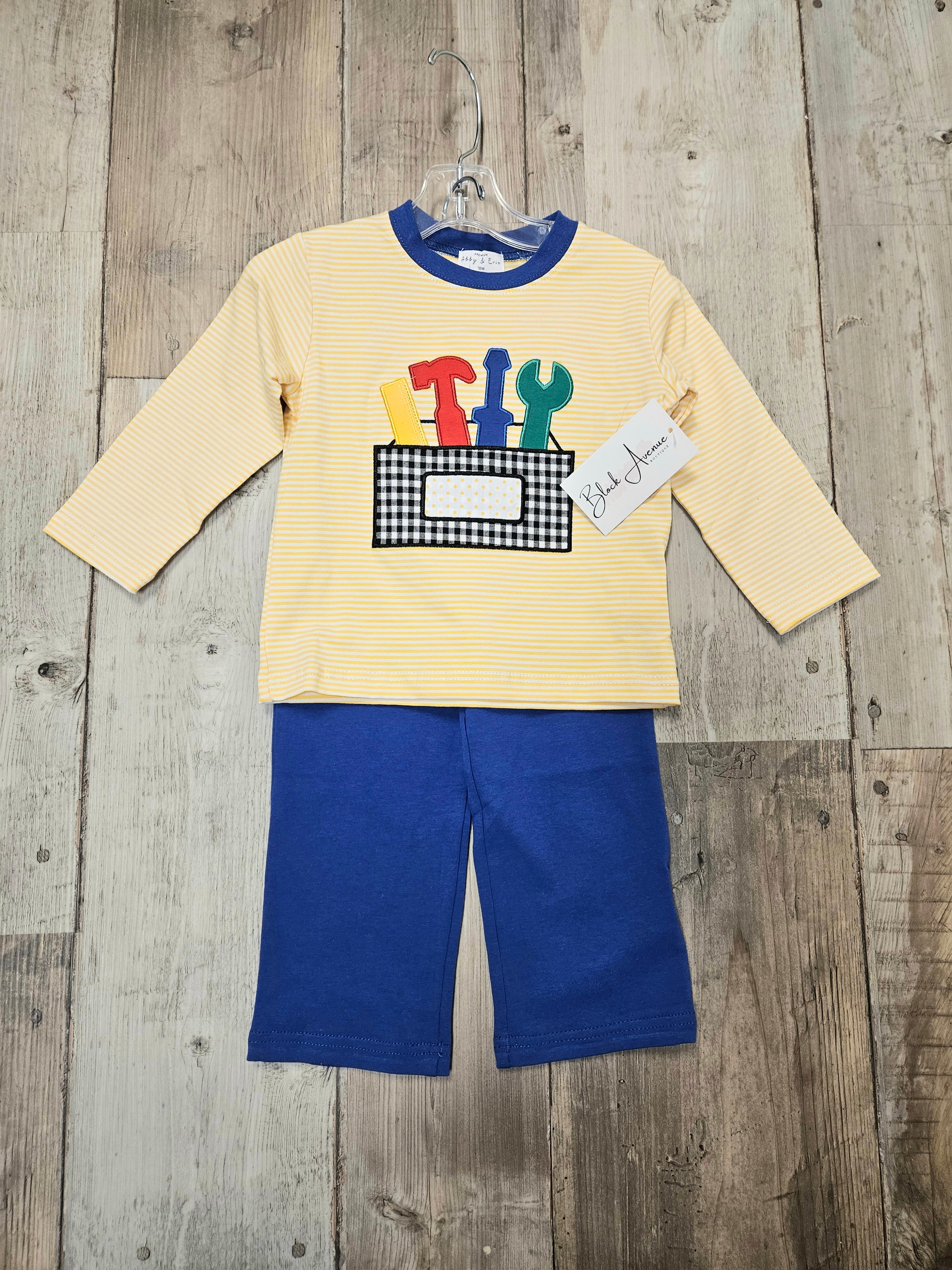 This Yellow Stripe Tool Boy Set features a long sleeve yellow stripe top with a creative tool set applique and royal blue pants. Made for both comfort and style, this set is perfect for little ones with a love for tools.